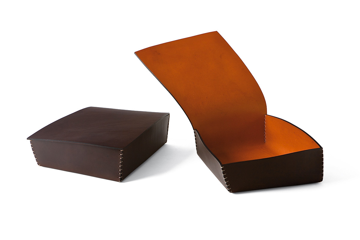 Tom is an irregularly shaped box, made from a single sheet of leather that is folded and hand stitched. Thickness, raw cutting, dyed edges, contrasting colour stitching are the details of the workmanship. The two-ply leather allows the choice of different colours for the inside and the outside, with single or two-colour solutions. Colours: orange, white, blue, grey, khaki, ochre, elm, black, red, sole, dark brown, wine.